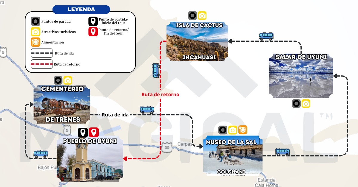 Después, nos instalaremos para observar el ocaso junto al espejo de agua. Retorno a Uyuni a las 6:00 pm.